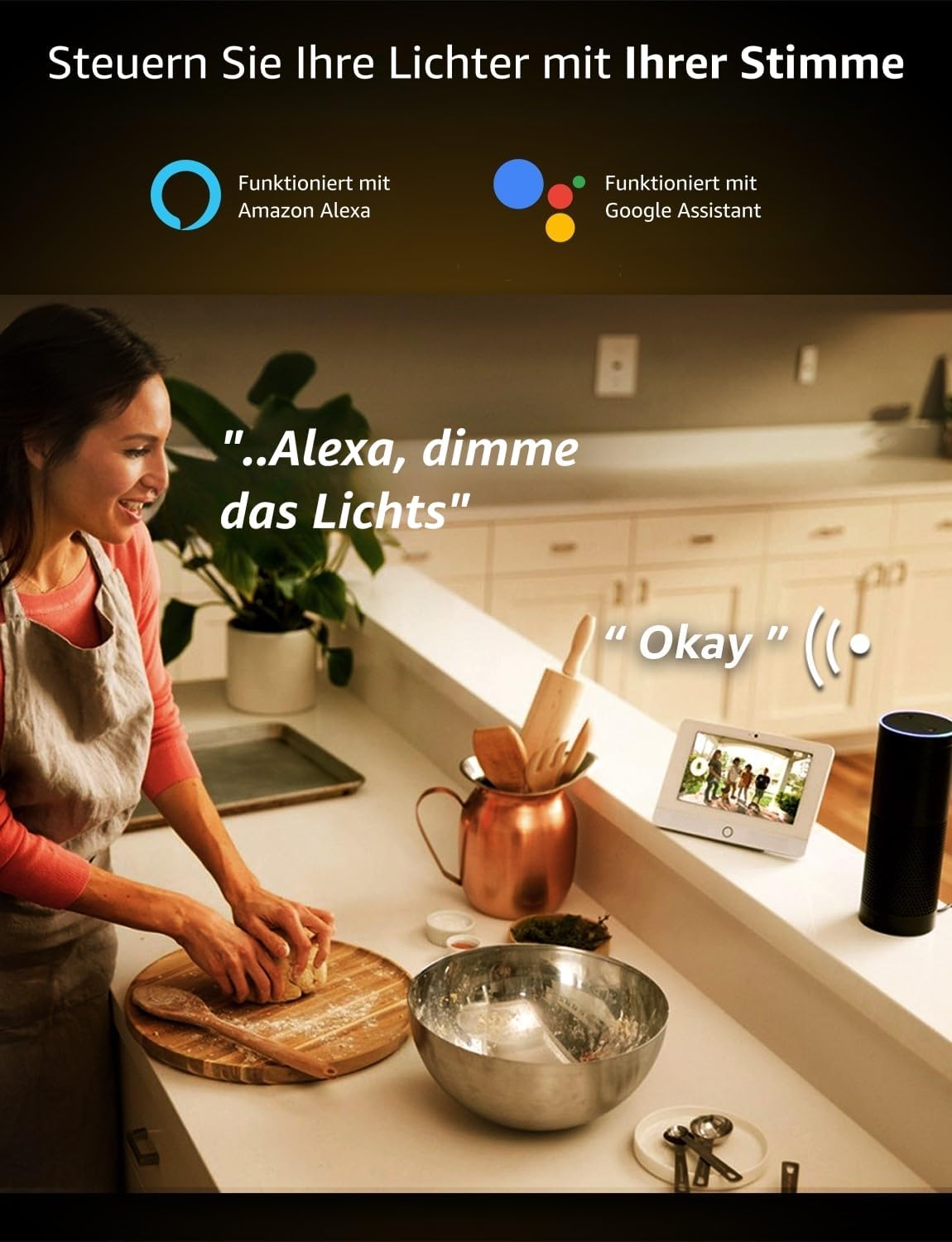Funktioniert mit Alexa und Google Home und ermöglicht esIhnen, die Beleuchtung mit einem einzigen Sprachbefehl freihändig zusteuern.