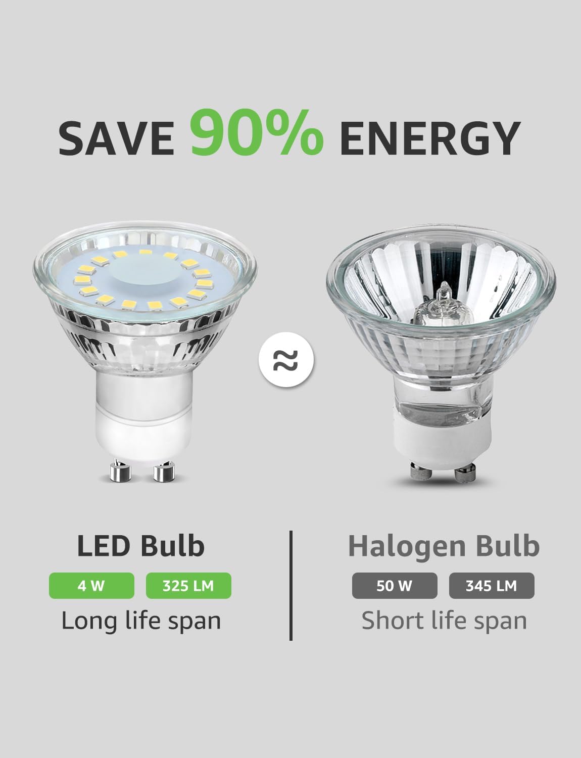 4W LED entspricht 50W Halogen und spart 90% Energie.Außerdem können siebis zu 15.000 Stunden dauern, wodurch sich dieHäufigkeit und dieKosten des Lampenwechsels verringern.