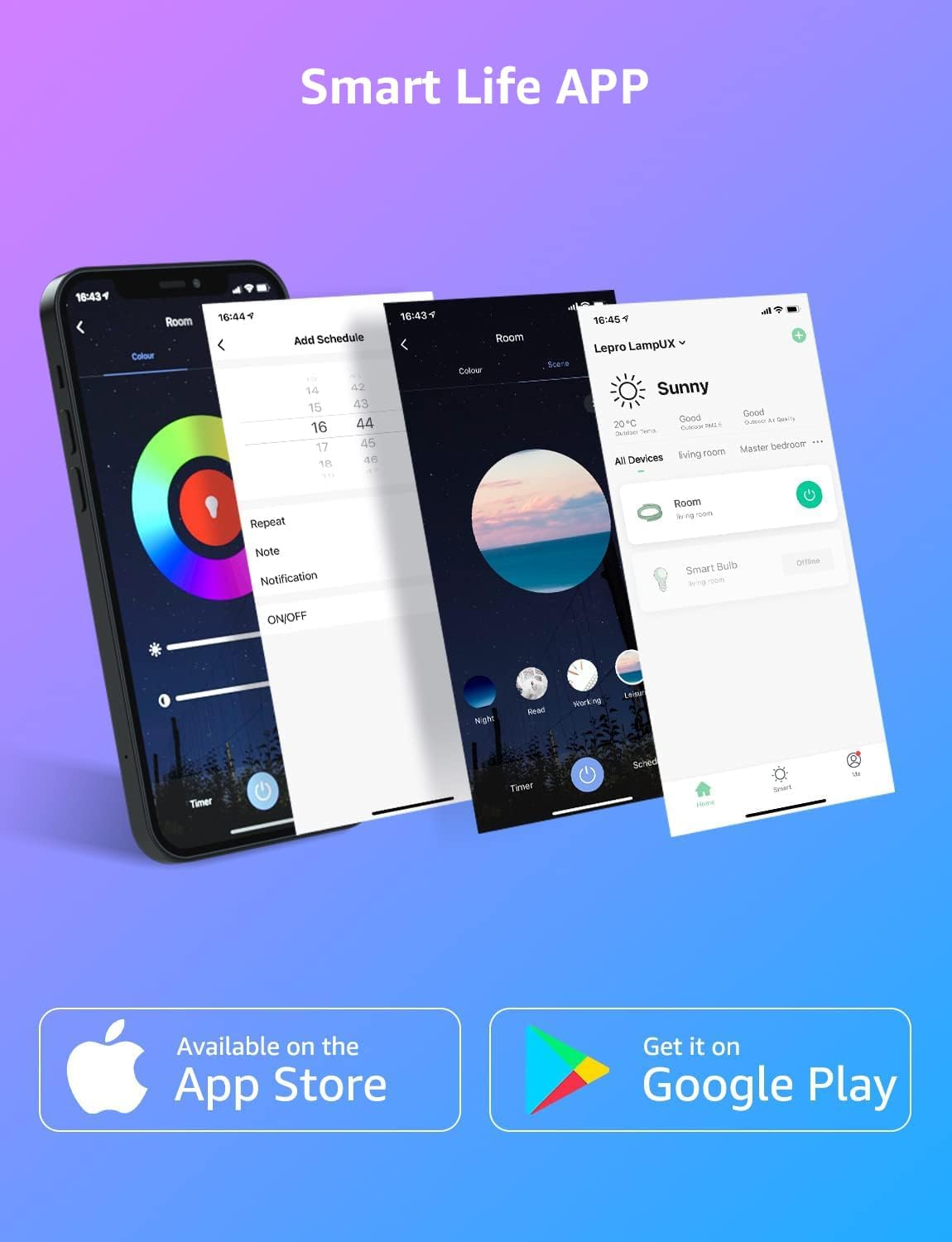 Sie können die Funktion und die Timer Funktion planen, um das LED Strip basierend auf der eingestellten Zeit automatisch ein- und auszuschalten. Sie können auch eine Weckzeit mit Ihrer Lieblingsfarbe einstellen.
