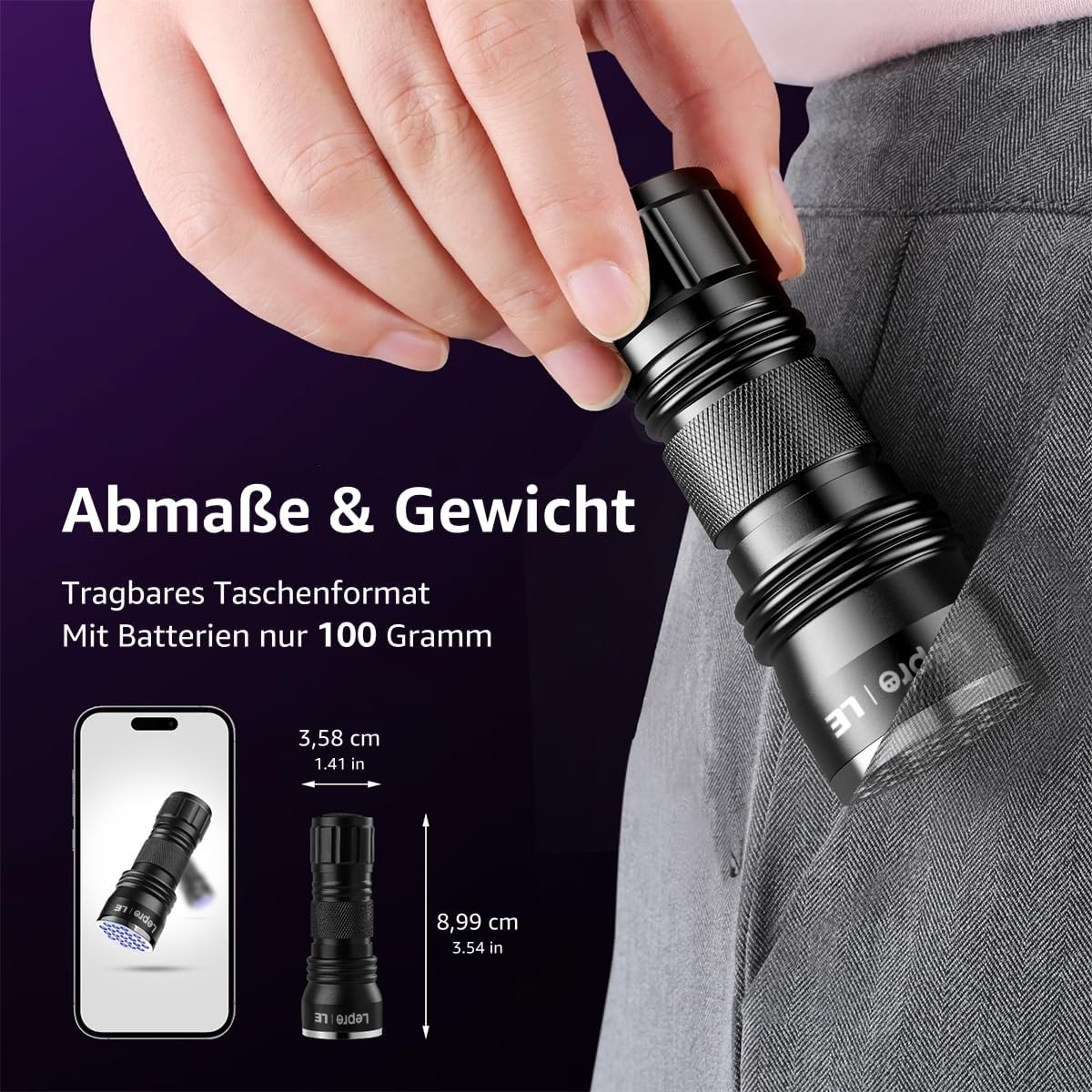 • Kompakt und Handlich: Diese UV-Flashlight ist ‎8.99 x 3.61 x 3.61 cm groß und 100g weigh, sehr klein und leicht, kann in einer Tasche nach Belieben gesteckt werden.