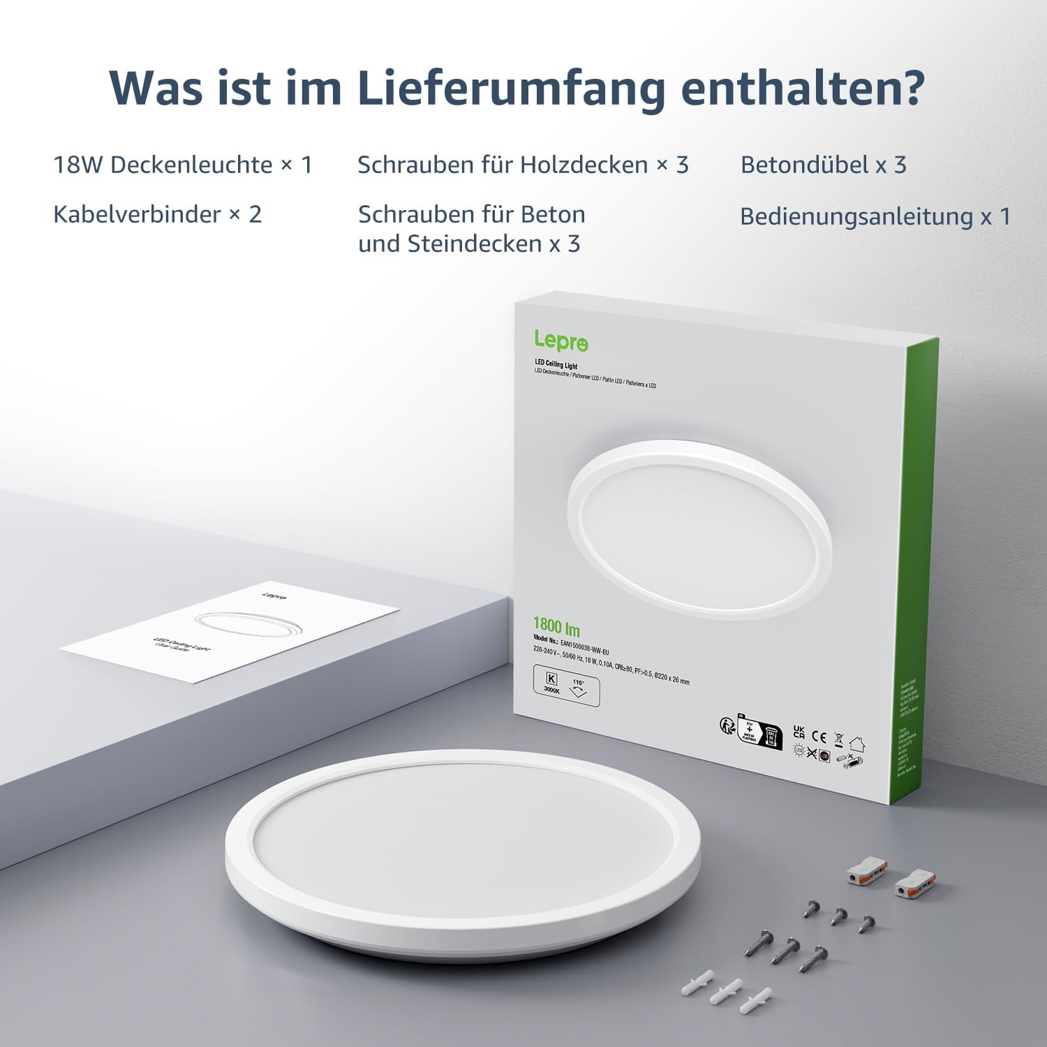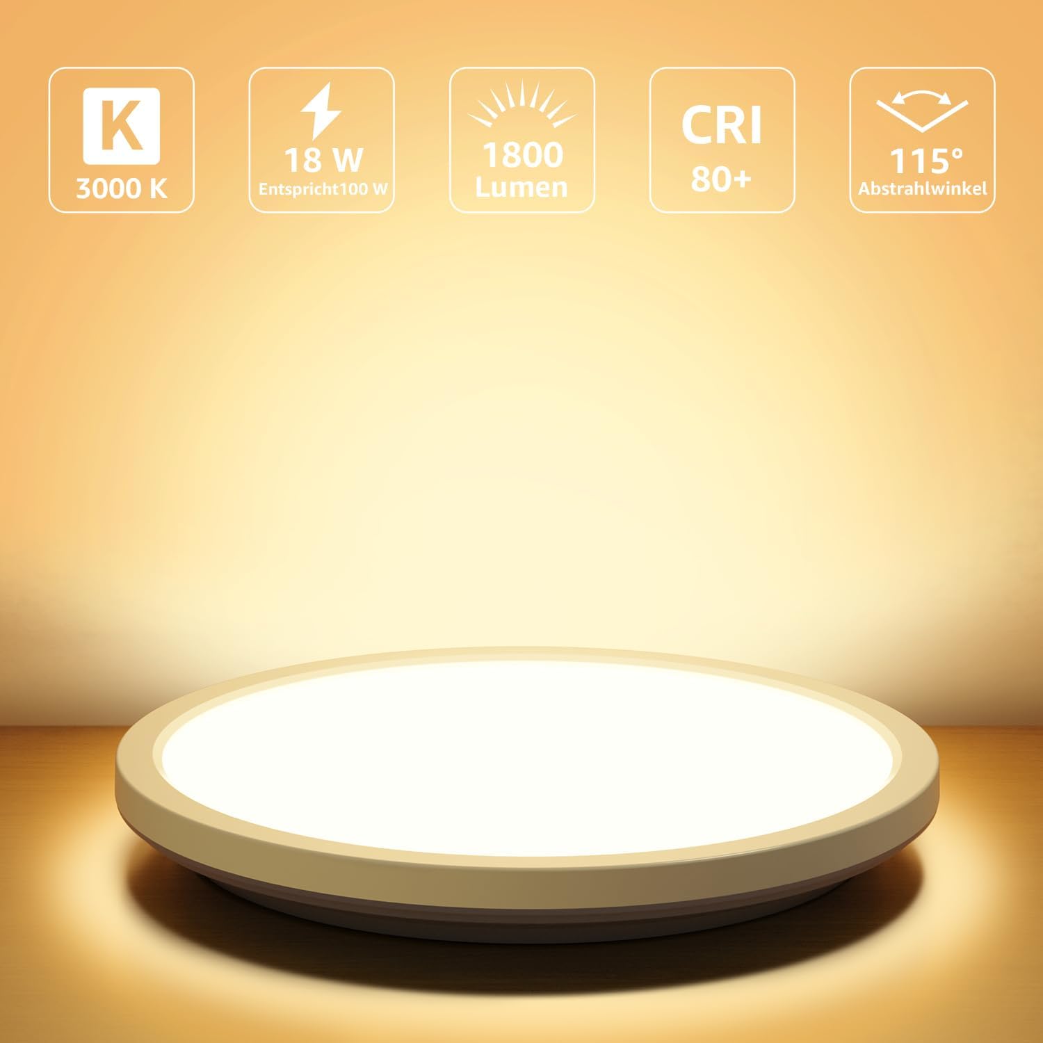 - Super hell und Energie sparend: Lepro 18W LED Deckenlampe entspricht 100W Glühlampe, kann jeden Raum mit ausreichend superhellem Licht und ausgezeichnetem 3000K warmweißem Licht versorgen. 1800LM Deckenleuchte kann 10-16㎡ / 108-172 sq ft Raum ausleuchten, ideal für Ihr Badezimmer, Schlafzimmer, Wohnzimmer usw.